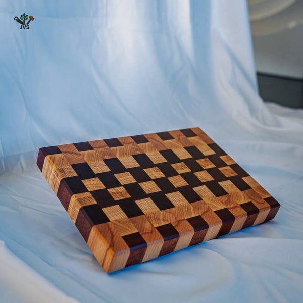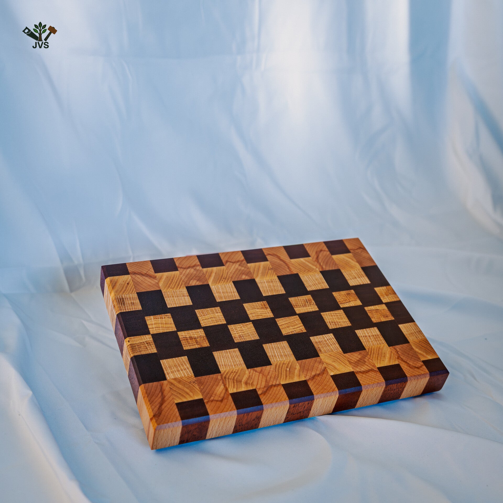 Mooie kopshouten snijplank met een uniek patroon door de contrasterende hout soorten, in dit geval, Mahonie, Beuken, Essen en Eiken. Afgewerkt met voedselveilige olie en een laagje bijenwas voor extra bescherming, perfect als borrel plankje of om de lekkerste maaltijden mee voor te bereiden.