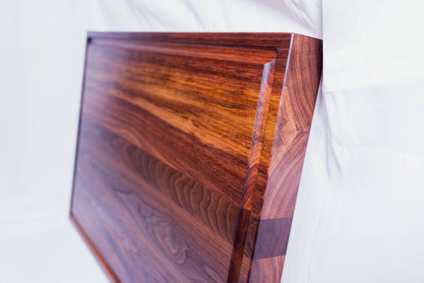 Een massief Walnoten snijplank van 60cm bij 40cm en zo ongeveer 4-4,5cm dik. Voorzien van rubberen voetjes en een sapgroef. Alleen op aanvraag mogelijk.
